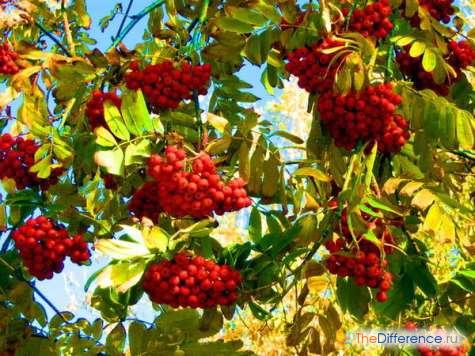 Оба растения используются как лекарственное сырье. При этом чаще всего в ход идут созревшие ягоды. Когда плоды обдаст первым морозом, их горечь улетучивается, поэтому лучшим временем для сбора считается поздняя осень. Рассмотрим, в чем разница между калиной и рябиной относительно их целебных свойств.