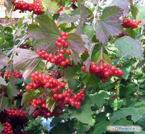 В строении, расцветке и вкусе ягод также заключается отличие калины от рябины. Плод калины – достаточно водянистая костянка, более мягкая на ощупь, чем ягода рябины. Плоская косточка внутри окрашена соком мякоти. Ягоды калины чисто красные, они покрыты тонкой кожицей и блестят снаружи, а их горький вкус выражен очень отчетливо.