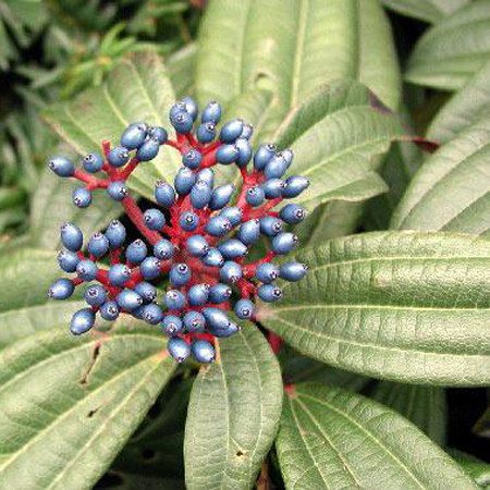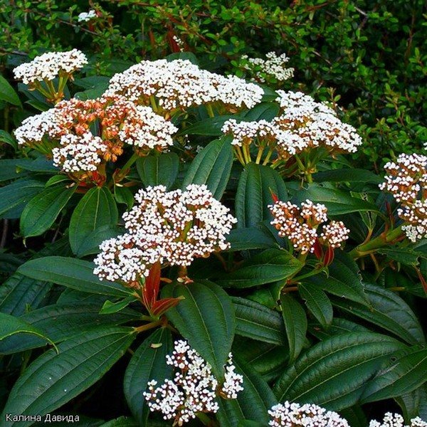 Калина Давида. На мой взгляд,одна из самых красивых.Растет очень медленно.Крона компактная,высота всего 0,5-0,8 м. Диаметр кроны в два раза больше. Очень декоративны листья кожистые, вечнозеленые, супротивные, эллиптические, длиной 7-15 см, шириной до 8 см, темно-зеленые. Характерны глубокие параллельные жилки. Цветки бело-розовые, собраны в зонтиковидные соцветия диамет-ром до 8 см. Цветет в июне. Плоды 6 мм длиной необычной голубой окраски, созревают в октябре.