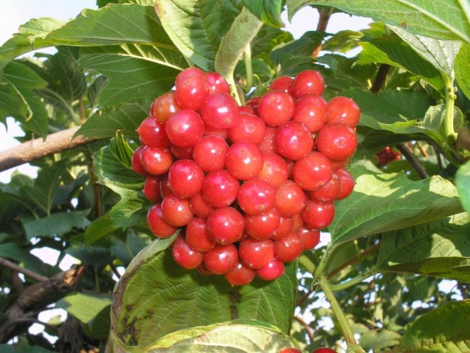 Калина Шукшинская, — этот сорт созревает в первых числах сентября. Внешне это куст (не дерево) имеет до шести скелетных сучьев и довольно активно растет. Листовые пластинки светло-зеленые, багровеют ближе к осени. Плоды скомпонованы в зонтиковидный щиток, они имеют шаровидную форму и массу около 0,55 г.